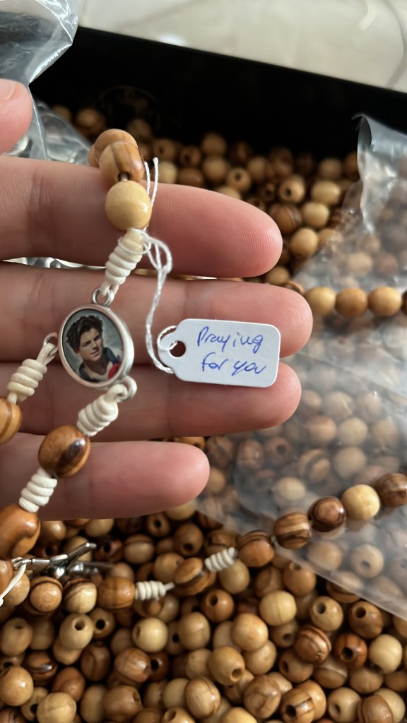 In accordo con la postulazione della Causa di Beatificazione e Canonizzazione del beato Carlo Acutis confezioniamo rosari con la reliquia ex linteo ricognitionis, li facciamo sia in legno che in ceramica. In parte i grani vengono preparati nel nostro laboratorio e in parte, quelli di ulivo, vengono prodotti in Terra Santa. I Rosari vengono dati ad offerta durante le missioni a cui partecipa l’Associazione.